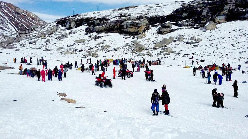 Rohtang Pass, at an altitude of 3979m (13,050 ft) above sea level, is another adventure tourist site where it can be cold even on a summer day. It is the highest point on the Manali-Keylong road and provides a wide panoramic view of mountains rising far above clouds, which is truly breathtaking. Close by is a small lake called Dassaur Lake. Beas Kund, the source of river Beas, is also nearby